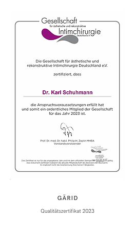 Mit der Verleihung der unterschiedlichen Zertifikate wird dem Facharzt Dr. Schuhmann bescheinigt, dass er diesen umfangreichen Qualitätsanforderungen als Plastischer und Ästhetischer Chirurg gerecht wird.